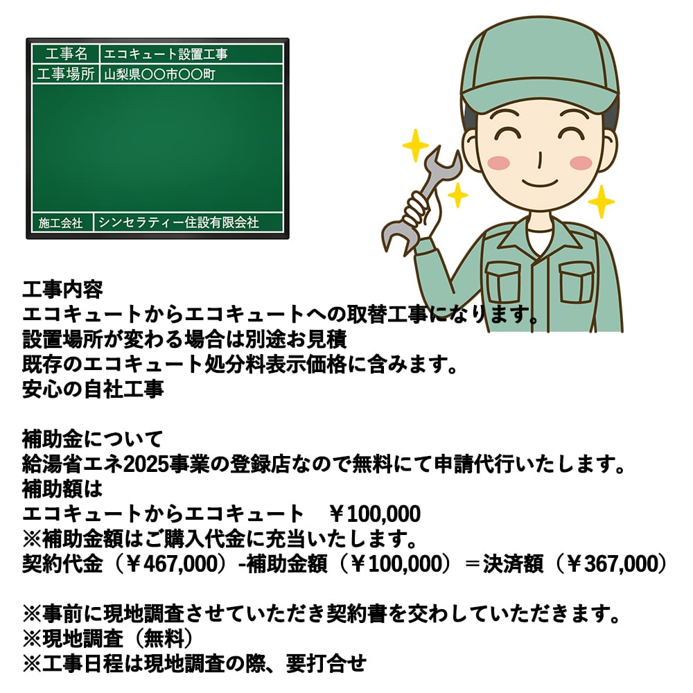 契約代金(¥467,000)-補助金額(¥100,000)=決済額(¥367,000)